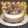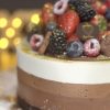 Começa com um chiffon de chocolate leve e delicado, que serve de base perfeita para receber três camadas cremosas e harmoniosas: mousse de Chocolate Negro com intensidade profunda, mousse de Chocolate de Leite com suavidade envolvente e mousse de Chocolate Branco com a doçura elegante que completa a experiência.